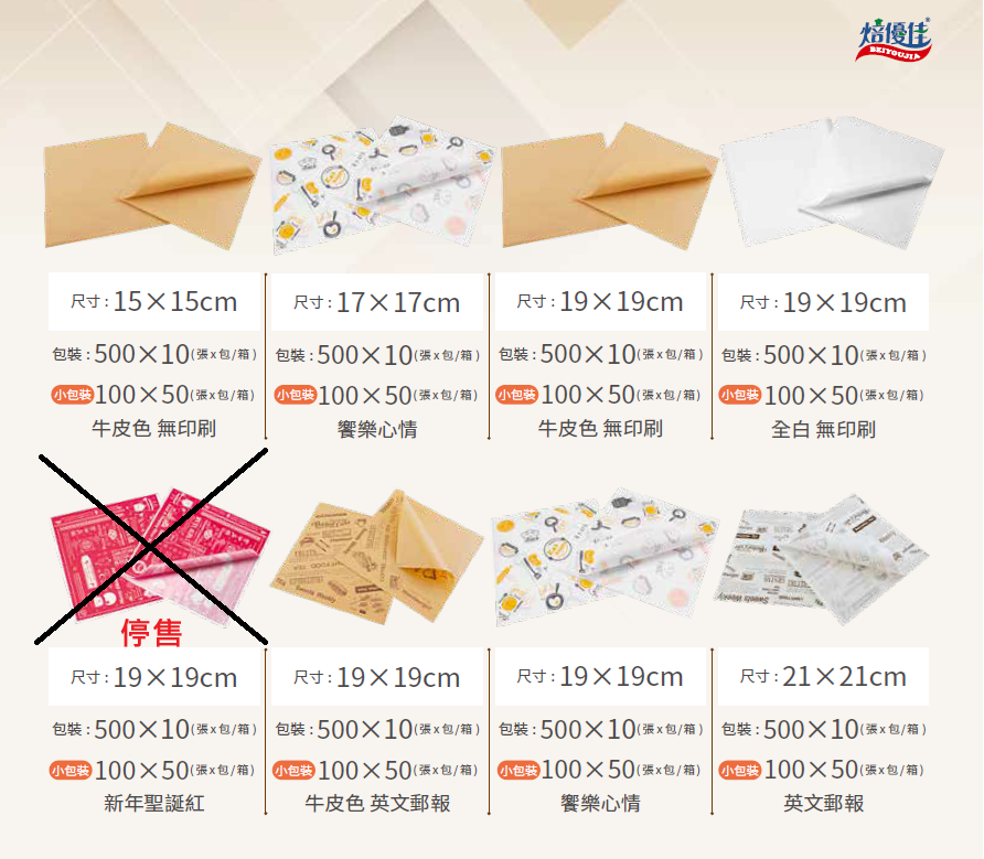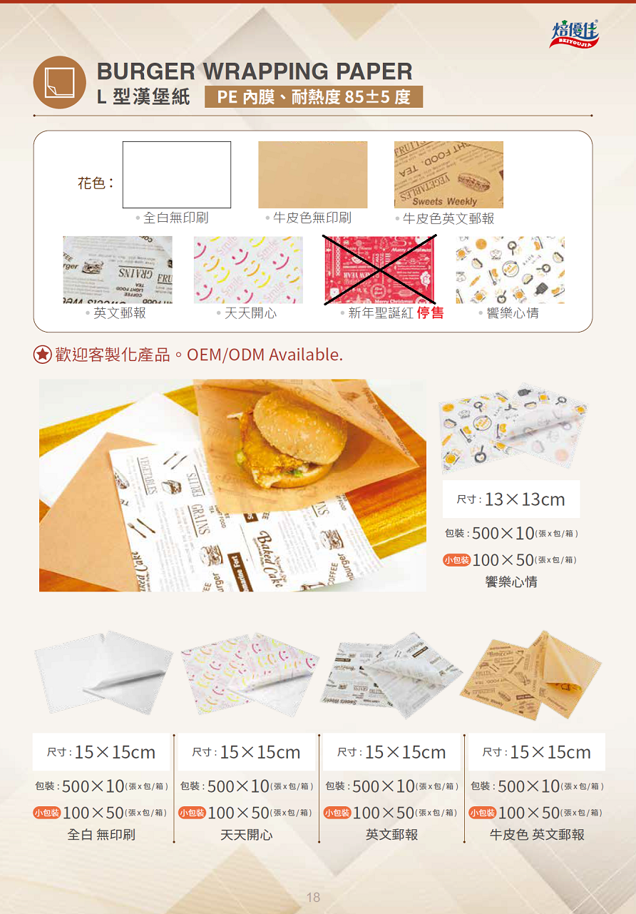 ★焙優佳★L型漢堡紙 適用各式漢堡, 三明治, 總匯, 輕食包裝、擺盤美觀 產品尺寸 : 21*21cm、19*19cm、15*15cm 產品包裝:100張/包(50包/箱)、500張/包(10包/箱) 花色:全白、全白英文郵報、牛皮色、牛皮英文郵報、天天開心 可私版印刷,印製專屬圖案及Logo, 尺寸多樣,呈現專屬獨特感,歡迎來電洽詢 新花色-饗樂心情
